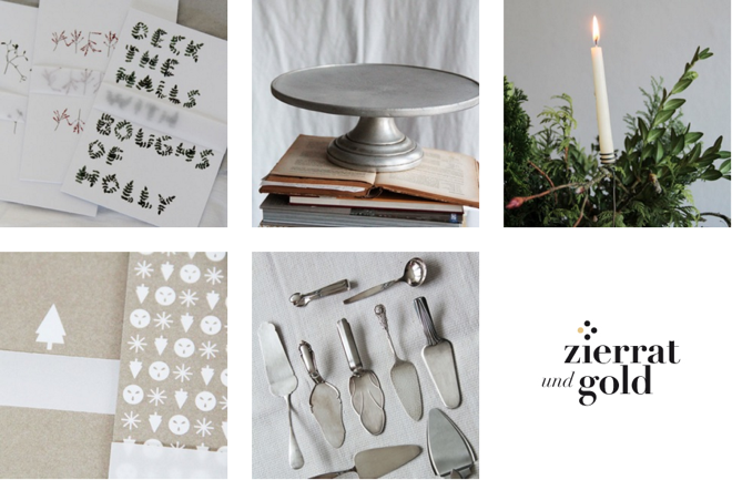 Nina, auch bekannt als Frl. Text und für erlesene Rezepte, hat sich vor gut drei Jahren einen Traum erfüllt. Im November 2012 öffnete zierrat und gold seine güldenen Pforten. Seither findet man in dem Online-Konzeptladen schöne und schönste Dinge aus dem Leben und der Küche: ausgesuchte Vintage-Stücke, Porzellan und Papier, Schmuck, Stoff und vieles mehr.